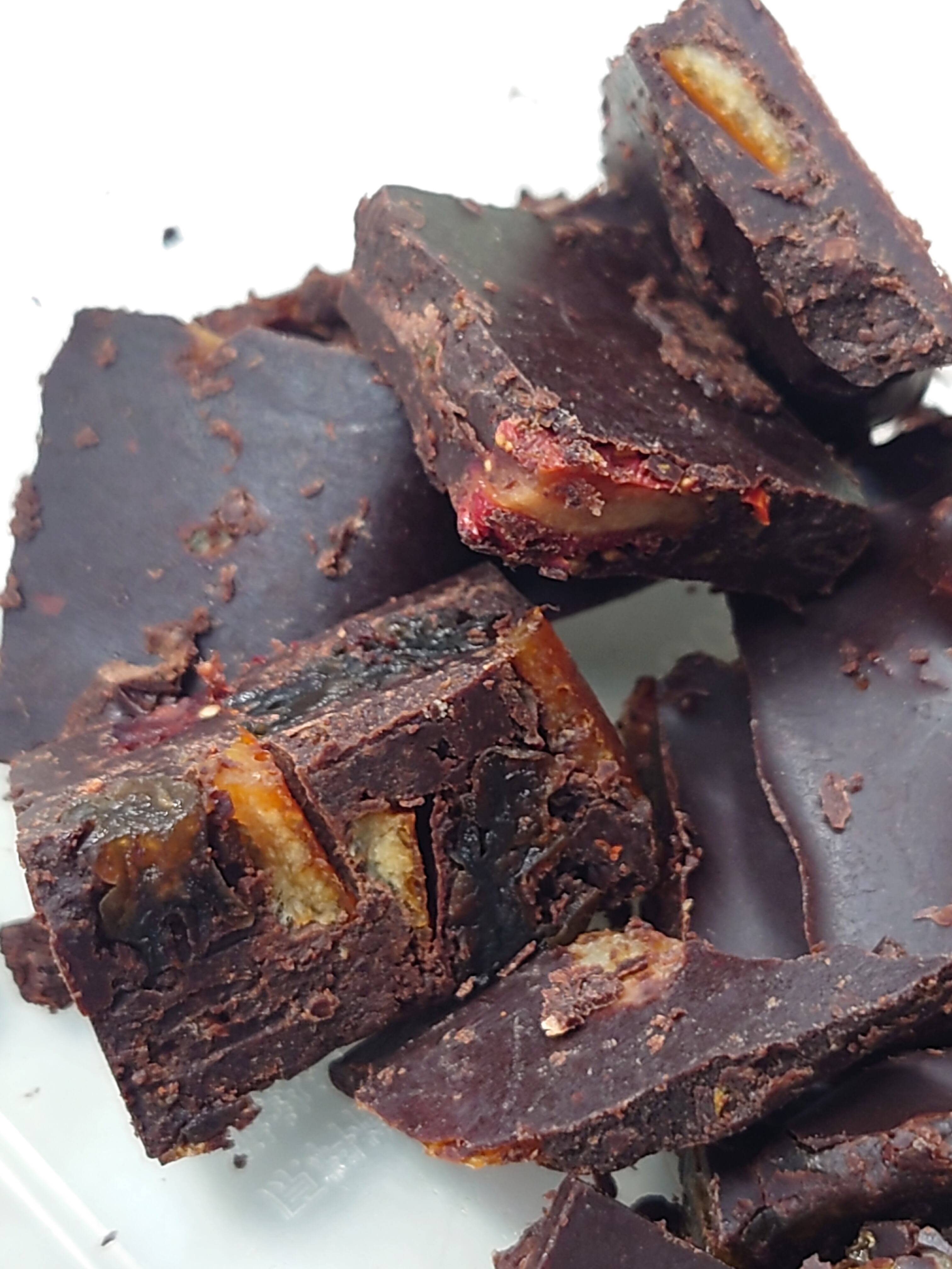 カカオマス・ココアバター・アガベシロップに、すりつぶしたカカオ豆を加えて、季節の湘南産ドライフルーツ、オレンジピール、隠し味に唐辛子・塩・バニラを少々入れています。